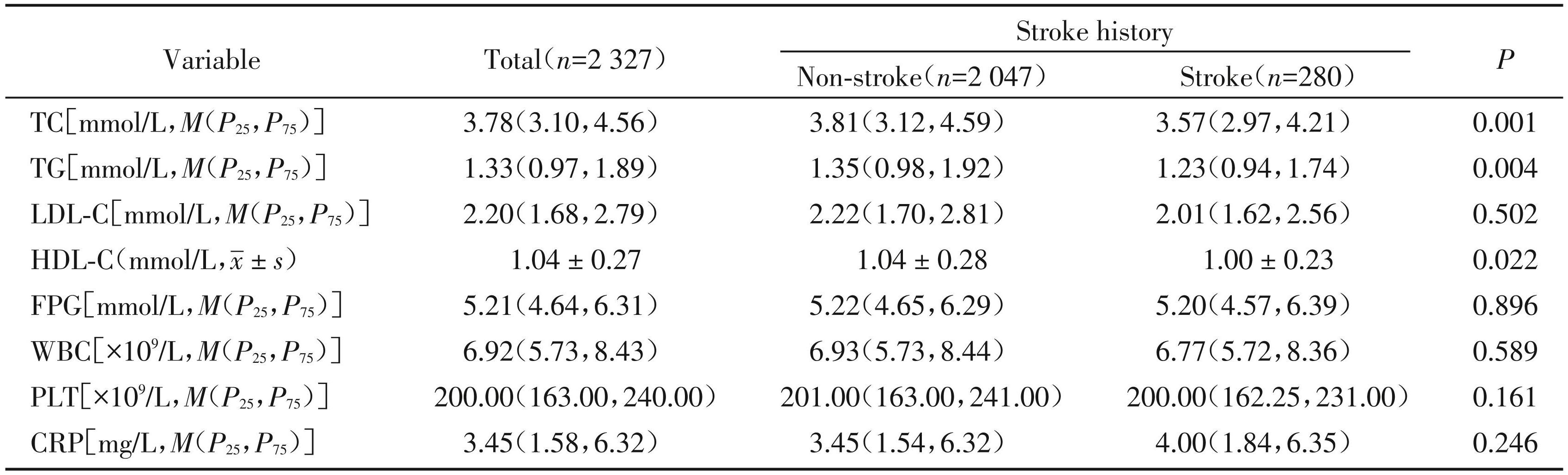 在本研究中共有冠心病患者 2 327 例,其中有脑卒中既往史患者280例(男201例,女79例),无脑卒中既往史患者 2 047 例(男 1 500 例,女 547 例)。在有无脑卒中既往史两组患者中,TC、TG、HDL⁃C、糖尿病、高血压、肾功能不全等因素的差异具有统计学意义(P均<0.05,表1~3)。