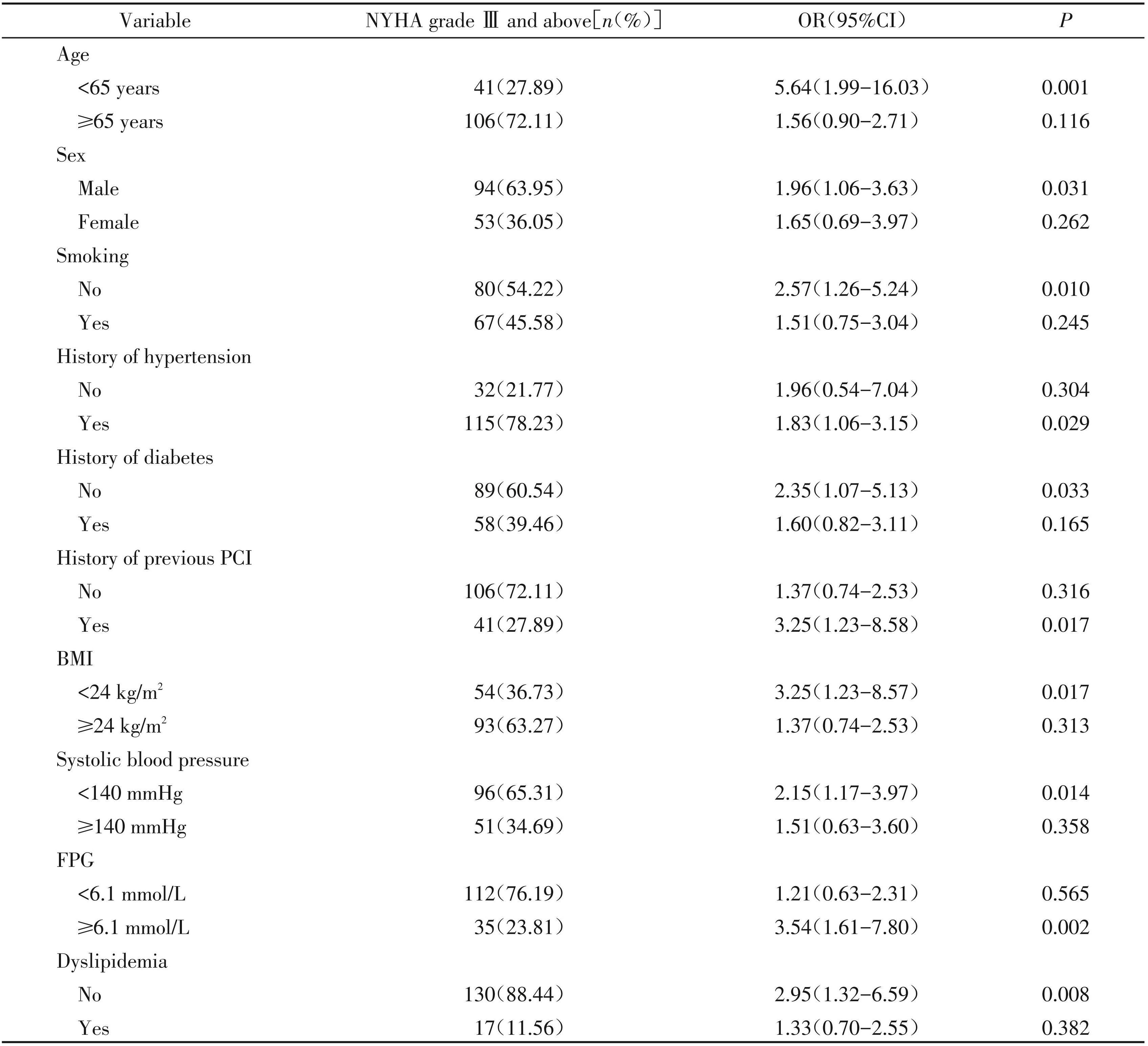 为进一步验证脑卒中既往史与冠心病患者 NYHA心功能分级的关系,进行了亚组分析,在调整了重要潜在协变量后的 Logistic 回归分析中发现,在年龄<65 岁、男性、BMI<24 kg/m2、空腹血糖≥ 6.1 mmol/L、收缩压<140 mmol/L无吸烟史、无糖尿病史、无血脂异常、有高血压病史或有既往PCI手术史的患者中,脑卒中既往史均与冠心病患者的NYHA 心功能分级显著相关(P均<0.05,表5)。