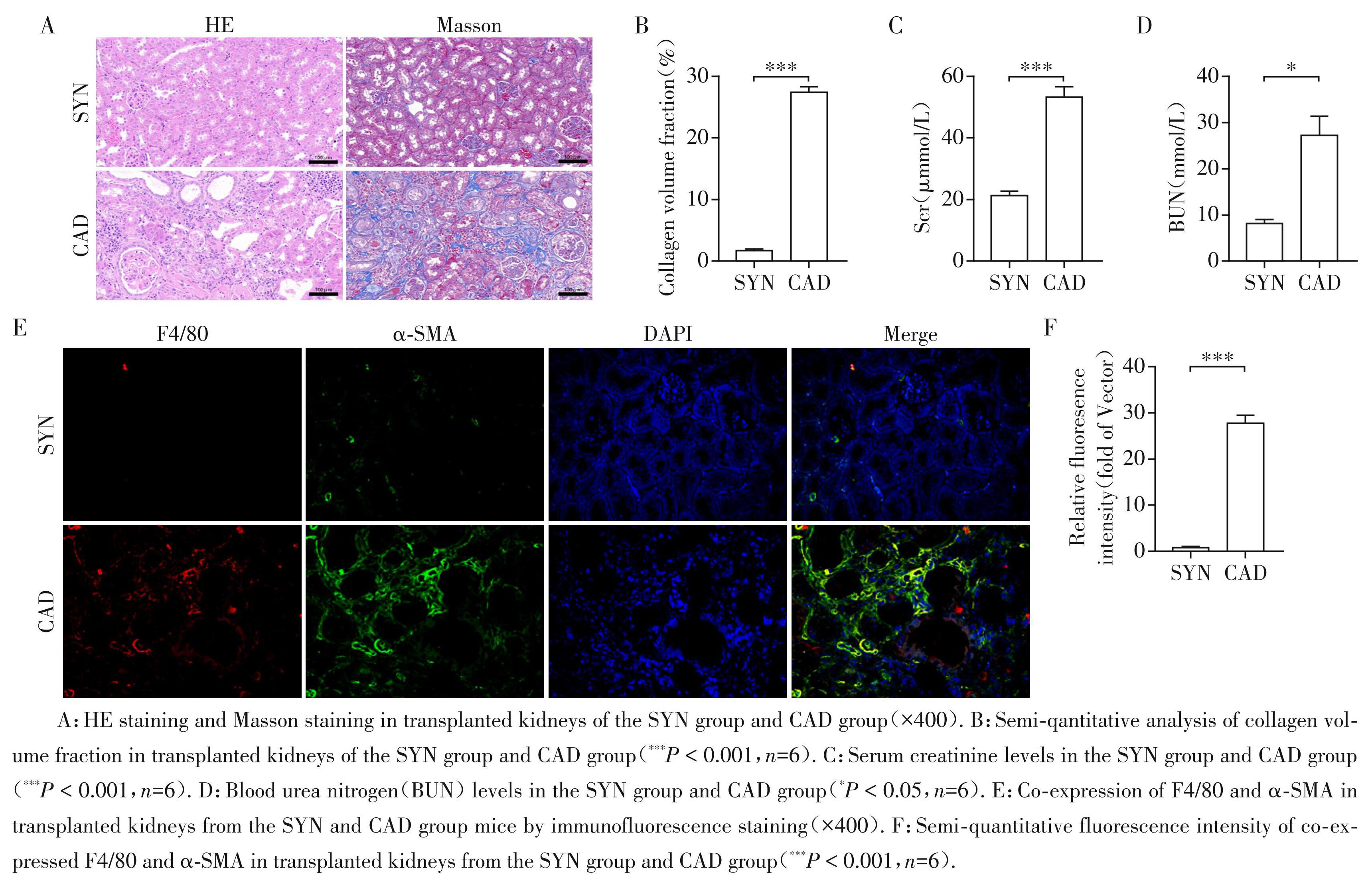 CAD组小鼠出现明显的肾小球硬化、肾小管萎缩、动脉内膜增厚等肾脏纤维化的病理表现(图1A)。与SYN组相比,CAD组小鼠移植肾间质纤维化明显加重,胶原沉积增多,胶原面积明显增加 (P <0.001,图1B);CAD组小鼠血清肌酐、尿素氮等指标也显著上升(P <0.05,图1C、D)。更重要的是,通过免疫荧光染色,在CAD组小鼠移植肾间质中发现了同时表达 F4/80(巨噬细胞表面标志物)和α⁃ SMA(肌成纤维细胞表面标志物)的细胞(P <0.001,图1E、F),提示慢性移植肾间质纤维化形成过程中存在显著的MMT过程。