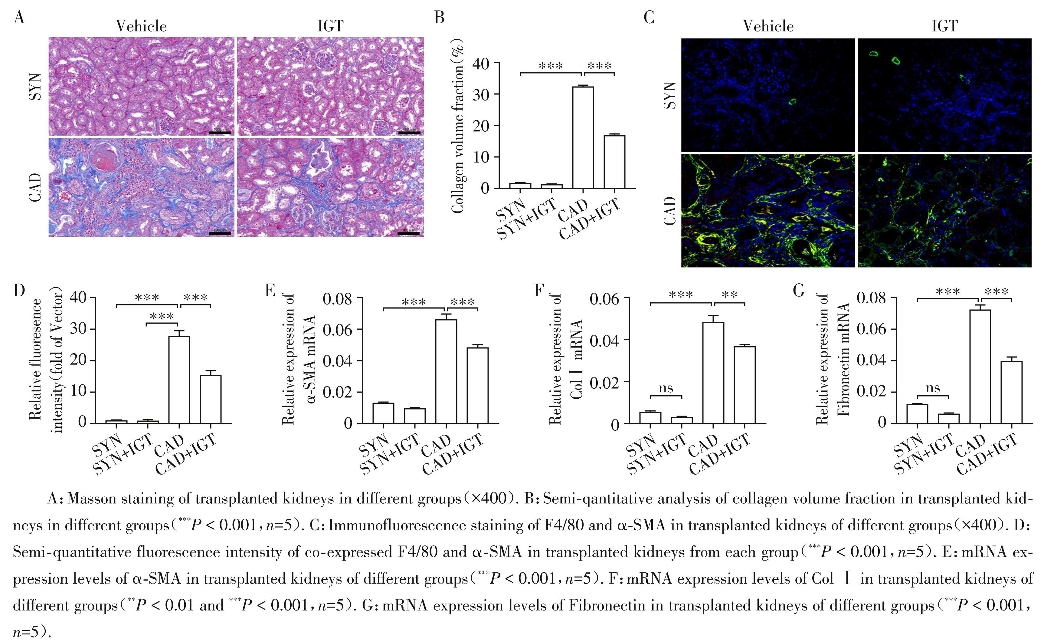 Masson 染色结果表明,相比 CAD 组,CAD+IGT 组小鼠移植肾间质纤维化明显改善,胶原面积明显减少(P <0.001,图2A、B);免疫荧光染色结果发现, CAD+IGT组小鼠移植肾间质中同时表达F4/80和α⁃ SMA的细胞明显减少,平均荧光强度明显下降(P <0.001,图2C、D);RT⁃qPCR的结果显示,IGT可显著降低CAD组小鼠α⁃SMA、ColⅠ及Fibronectin mRNA 水平(P <0.01,图2E~G)。结果表明IGT可显著减缓慢性移植肾间质纤维化的发生及MMT过程。