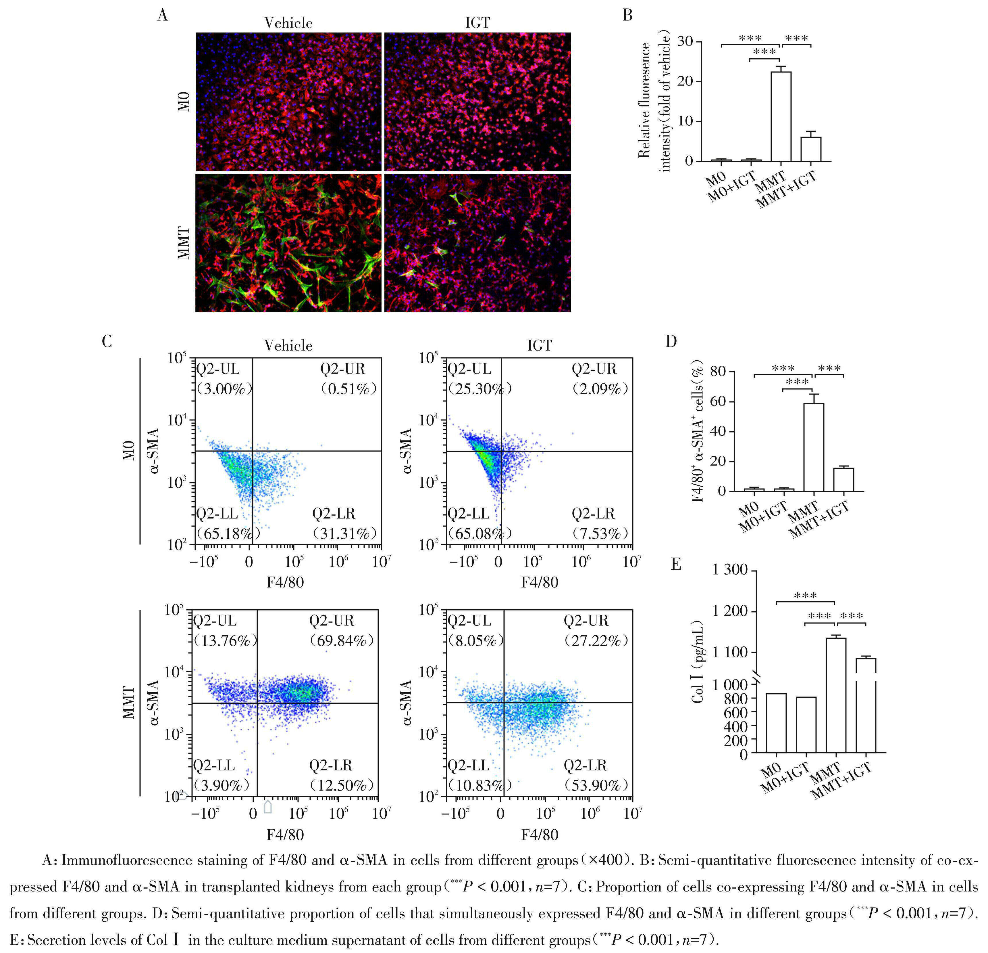 为探讨IGT减缓移植肾间质纤维化形成的作用机制,体外构建MMT细胞模型。流式细胞与免疫荧光染色结果均显示,与M0组相比,MMT组同时表达 F4/80和α⁃SMA的BMDM细胞明显增多(P <0.001,图3A~D);而加入 IGT 干预后,MMT+IGT 组同时表达 F4/80 和α⁃SMA 的细胞显著减少(P <0.001,图3A~D)。收集各组细胞的培养基上清并进行酶联免疫吸附实验,IGT 干预减少了 BMDM 细胞上清中 ColⅠ的分泌(P <0.001,图3E)。上述结果提示,IGT 可在细胞模型中抑制MMT。