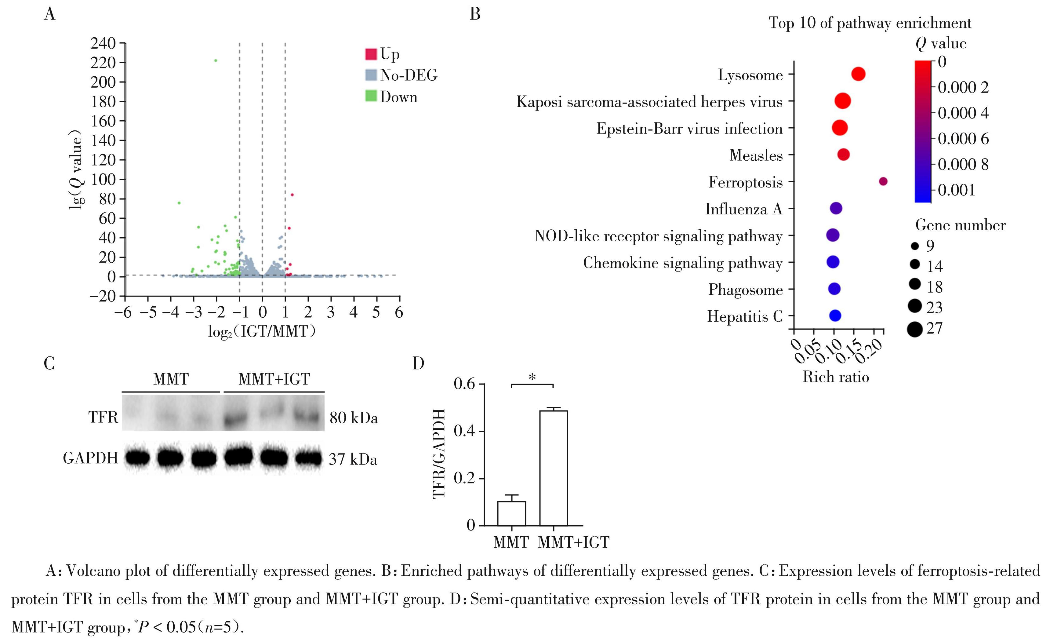 收集MMT组和MMT+IGT组的细胞进行RNA的提取与纯化收集,RNA样本委托公司进行转录组学测序。结果如图4A所示,差异表达基因共537个,其中,基因表达上调有 233 个,包含 H6pd、Rusc2、 Gm4631、Slc16a6、Ankrd28等;下调基因有304个,包含 lfi208、lsg15、Tgtp2、Mndal、Gvin2 等;差异基因富集在铁死亡相关信号通路、NOD 样受体信号通路、趋化因子信号通路等。在排名前10的信号通路中,铁死亡相关信号通路富集程度最大(图4B)。对 MMT细胞模型行Western blot检测,结果显示,相比 MMT 组,MMT+IGT 组 TFR 蛋白表达水平明显升高 (P <0.05,图4C、D)。