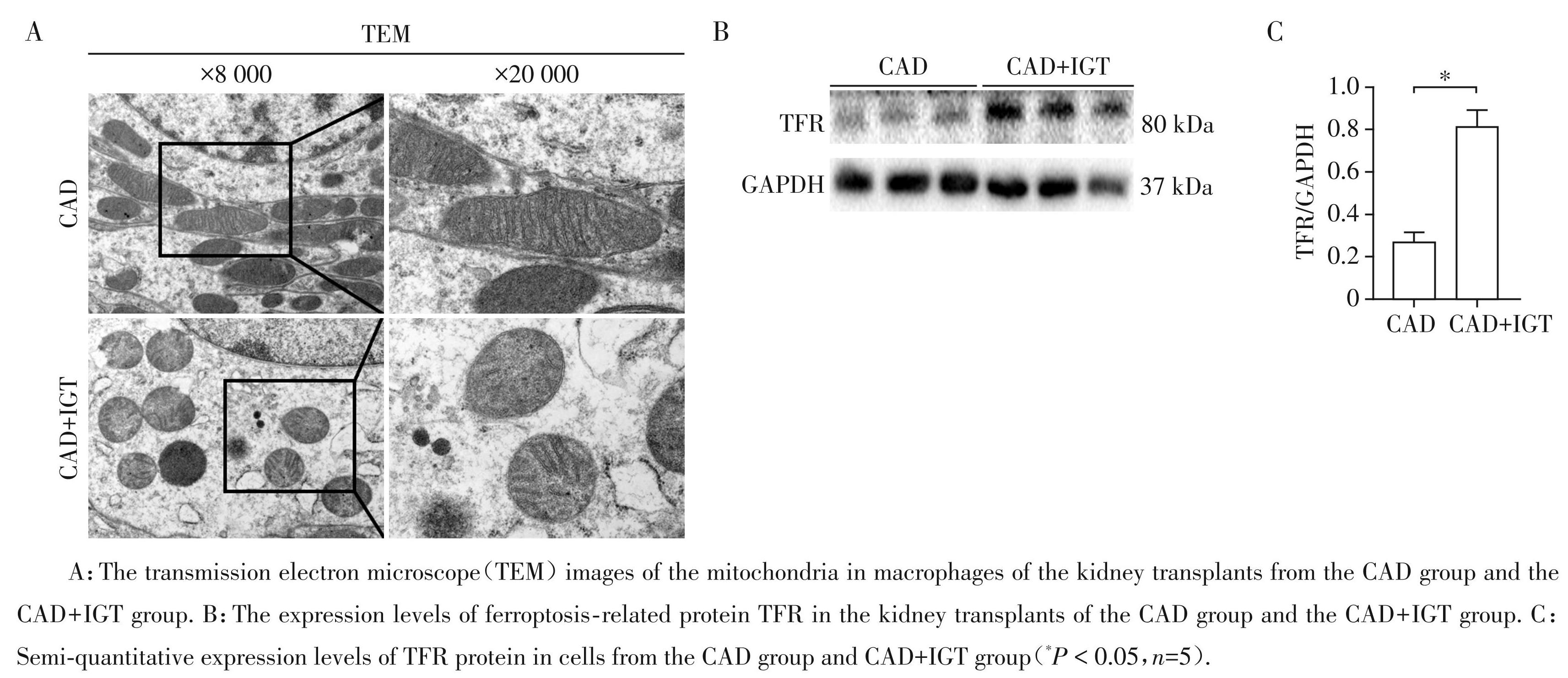 为了探明在动物模型中,IGT 是否也发挥着抑制铁死亡的作用。取CAD组小鼠和CAD+IGT组小鼠的移植肾,于电镜下观察巨噬细胞内线粒体情况。结果表明,CAD+IGT组移植肾中巨噬细胞出现线粒体萎缩、线粒体膜密度增加、线粒体嵴减少等铁死亡表现(图5A)。同样,提取移植肾标本蛋白行Western blot实验,结果显示,相比CAD组,CAD+IGT 组 TFR 蛋白表达水平明显升高(P <0.05,图5B、 C)。TFR的主要生理功能是与转铁蛋白结合,通过内吞方式介导细胞对铁的摄取。但是过多的铁则可能催化活性氧(reactive oxygen species,ROS)并损伤生物大分子,诱发铁死亡。以上结果表明,IGT减轻小鼠移植肾间质纤维化可能是通过诱导正在经历MMT的巨噬细胞发生铁死亡而实现的。