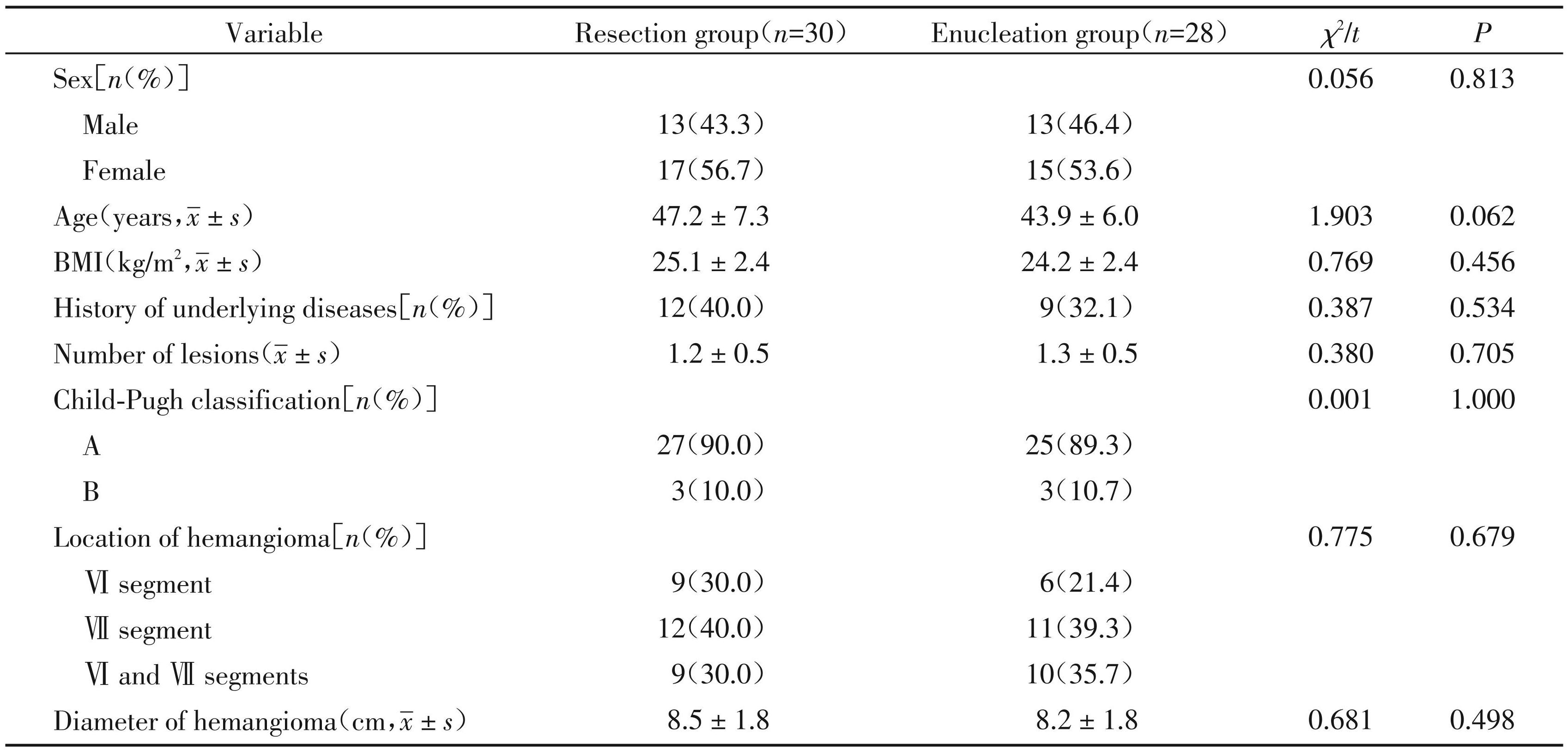 本研究为回顾性研究。收集了 2020 年 1 月— 2024 年 8 月于南京医科大学附属苏州医院诊治的 58例肝右后叶血管瘤患者的临床资料。诊断符合 《HH诊断和治疗多学科专家共识(2019年版)》的标准[5],并经 CT 或 MRI 等影像学检查诊断。纳入标准:①通过彩超、CT或MRI确诊为肝右后叶HH;②肿瘤长径>5 cm;③符合HH 的临床表现;④对患者的日常生活和工作造成影响,需接受外科治疗;⑤符合 Child⁃Pugh 肝功能分级为 A 或 B 级,具备手术耐受性;⑥年龄>18岁。排除标准:① 合并明确诊断的恶性肿瘤;② 合并其他肝脏疾病;③ 有严重的出血倾向;④ 合并严重的心、肾、肺等器官功能障碍;⑤ 接受开腹、介入治疗等其他治疗方案;⑥ 先天性身体残疾或有精神病史。依据术式,将患者分为切除术组(n=30)与剥除术组(n=28)。本研究经苏州市立医院伦理委员会批准(伦理审查编号:KL901538)。所有患者知情同意。