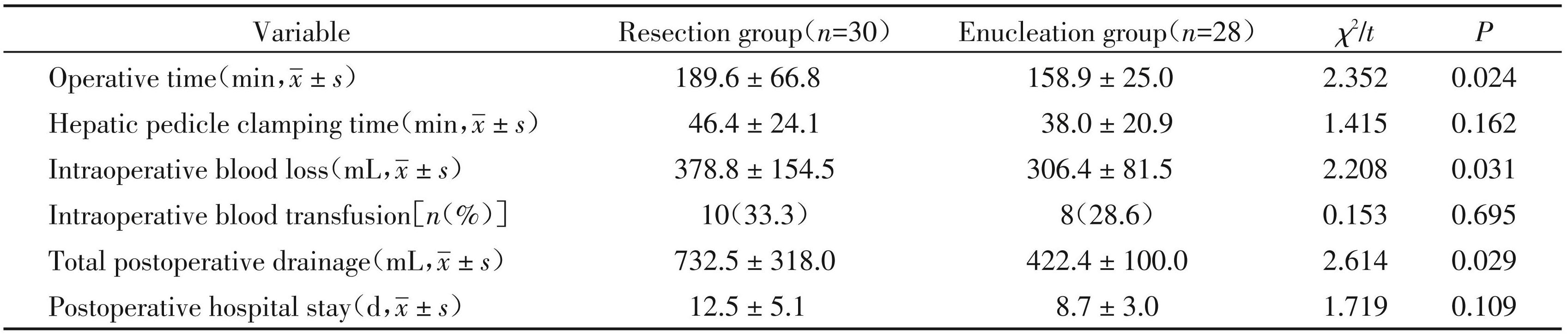 两组患者肝门阻断时间、输血例数和术后住院时间比较差异均无统计学意义(P >0.05);剥除术组手术时间、术中出血量和术后总引流量显著少于切除术组(P<0.05,表2)。