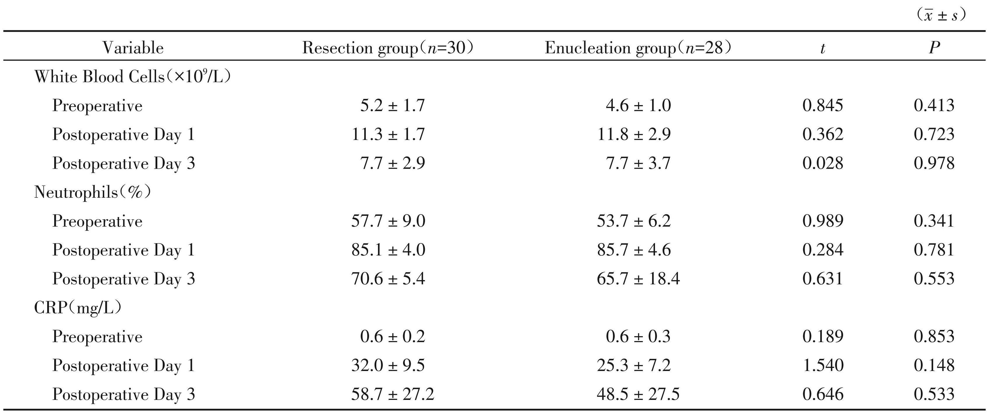 两组患者术前及术后第1天和第3天,白细胞、中性粒细胞和C⁃反应蛋白呈现升高趋势,差异均无统计学意义(P >0.05,表4)。
