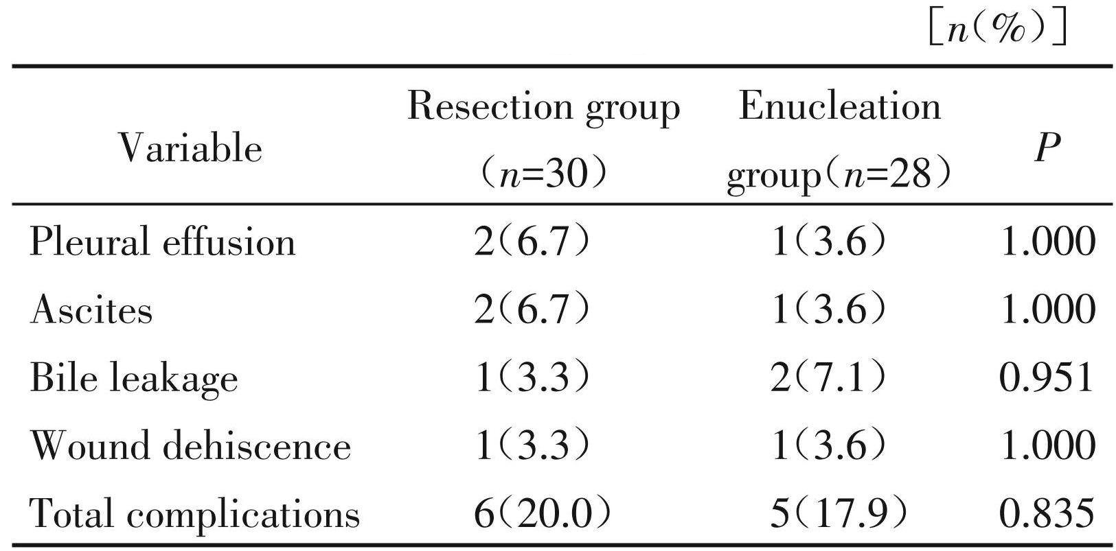 剥除术组术后发生胸腔积液1例、腹腔积液1例、胆漏0例、切口液化2例;切除术组术后发生胸腔积液2例、腹腔积液1例、胆漏2例、切口液化1例,两组术后并发症总发生率比较,差异无统计学意义 (χ2 =0.043,P=0.835,表5)。