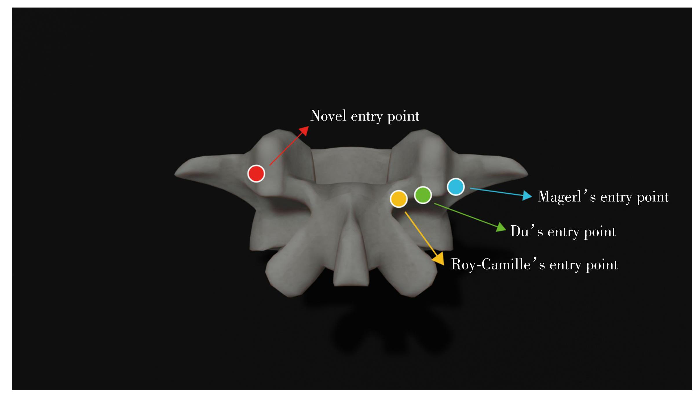 目的:提出一种新型腰5进钉点,并通过与传统Magerl法置钉进行对比,验证其可行性与准确性,以改进腰5椎体椎弓根螺钉置入技术。方法:选取2020年6月—2023年12月南京医科大学第一附属医院需行腰5椎弓根螺钉内固定的患者60例,分为新型进钉组(Novel组,30例)和传统Magerl法组(Magerl组,30例)。两组各置入60枚腰5椎弓根螺钉,采用Gertzbein和 Robbins提出的分类法来评估置钉准确性。比较两组间置钉满意率、术中透视剂量、手术时间、术中出血量和术后有无神经根侵犯症状。结果:Novel组置钉满意率为95%,显著高于Magerl组80%(P=0.013)。两组患者手术时间、术中出血量、透视剂量差异均无统计学意义(P > 0.05)。结论:新型腰5进钉点可显著提高置钉精度,且未增加手术风险,具有临床应用潜力。
