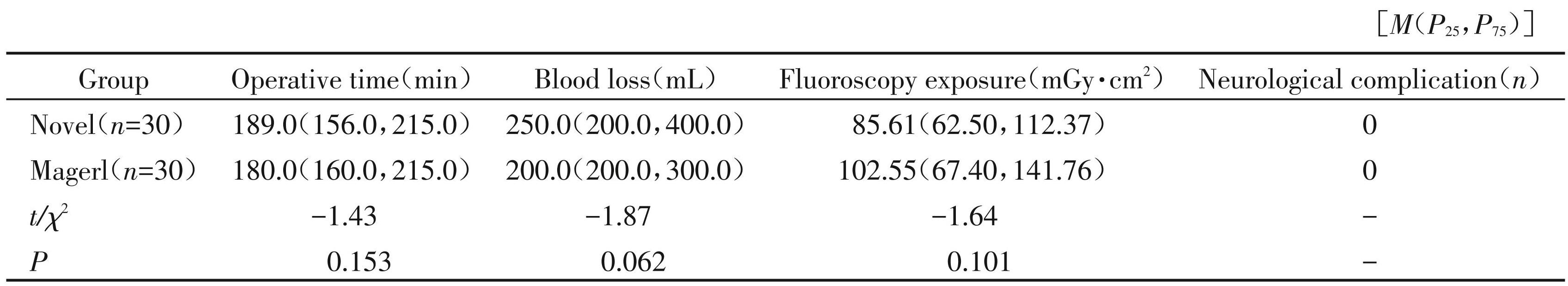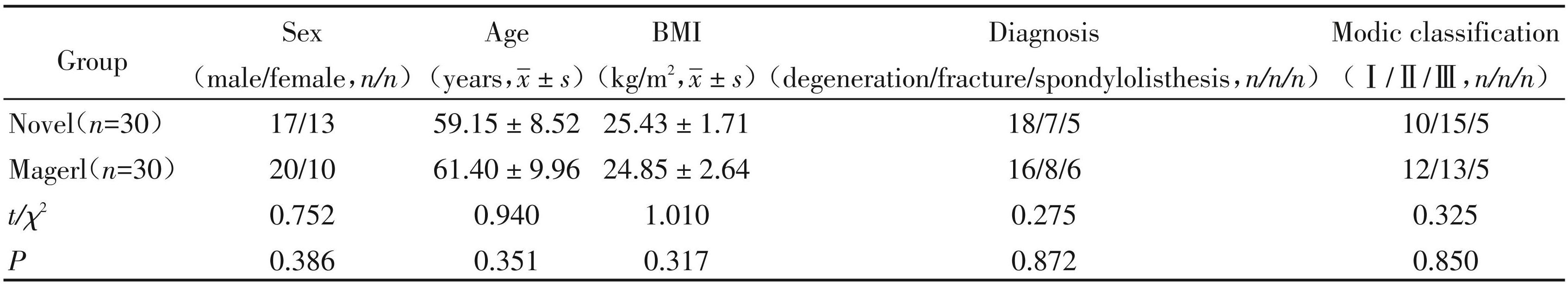 本研究共纳入60例患者,其中男37例,女23例,年龄39~89岁。其中Novel组30例,Magerl组30例。两组患者在年龄、性别、体重指数(body mass index, BMI)、术前诊断、Modic分型方面差异无统计学意义 (P均>0.05,表1)。