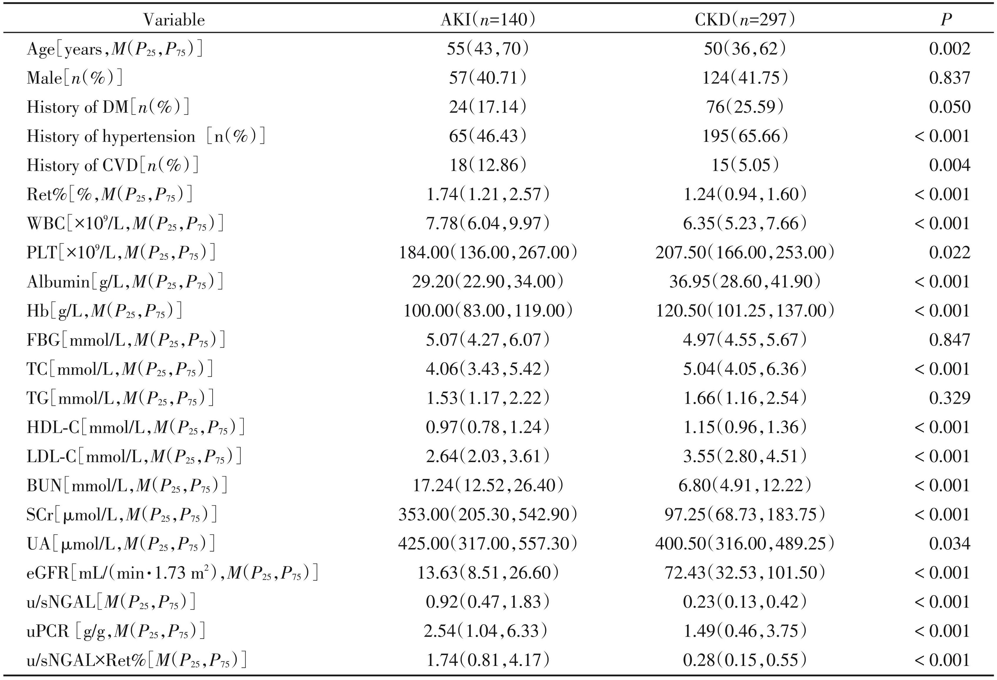 本研究共纳入了 437 例患者,其中 140 例 (32.0%)AKI患者,297例(68.0%)CKD患者。AKI组患者病因包括原发性肾小球肾炎进展(24.3%),血管炎(11.4%),糖尿病肾病(8.6%),狼疮性肾炎 (5.4%),过敏性紫癜性肾炎(2.1%),抗肾小球基底膜肾炎(1.4%),高尿酸痛风性肾病(2.1%),高血压急症(1.0%),流行性出血热(4.3%),多发性骨髓瘤 (1.4%),尿路梗阻(1.4%),横纹肌溶解症(1.4%),肾前性损伤(0.7%),活检证实的急性间质性肾炎 (15.0%),活检证实急性肾小管坏死(3.6%),不明原因(15.9%)。CKD组患者病因包括原发性肾小球肾炎(47.8%),糖尿病肾病(22.2%),痛风性肾病 (9.4%),高血压肾病(5.1%),狼疮性肾炎(4.8%),过敏性紫癜性肾炎(2.0%),血管炎(1.3%),不明原因 (7.4%)。如表1所示,CKD 组高血压患病率较高, AKI组心血管患病率较高,两组糖尿病患病率差异 P=0.05,位于临界值,提示 CKD 组糖尿病患病率较 AKI组有增高的趋势,有待于样本量增加进一步明确其变化是否具有统计学意义。与CKD 组患者相比,AKI 组年龄、白细胞、Ret%、尿素、肌酐、尿酸、 uPCR、u/sNGAL以及u/sNGAL×Ret%水平升高,而血红蛋白、白蛋白、血小板计数、总胆固醇、高密度脂蛋白胆固醇、低密度脂蛋胆固醇以及 eGFR 水平降低。两组性别(P=0.837)、空腹血糖(P=0.847)、甘油三酯(P=0.329)基线差异无统计学意义。