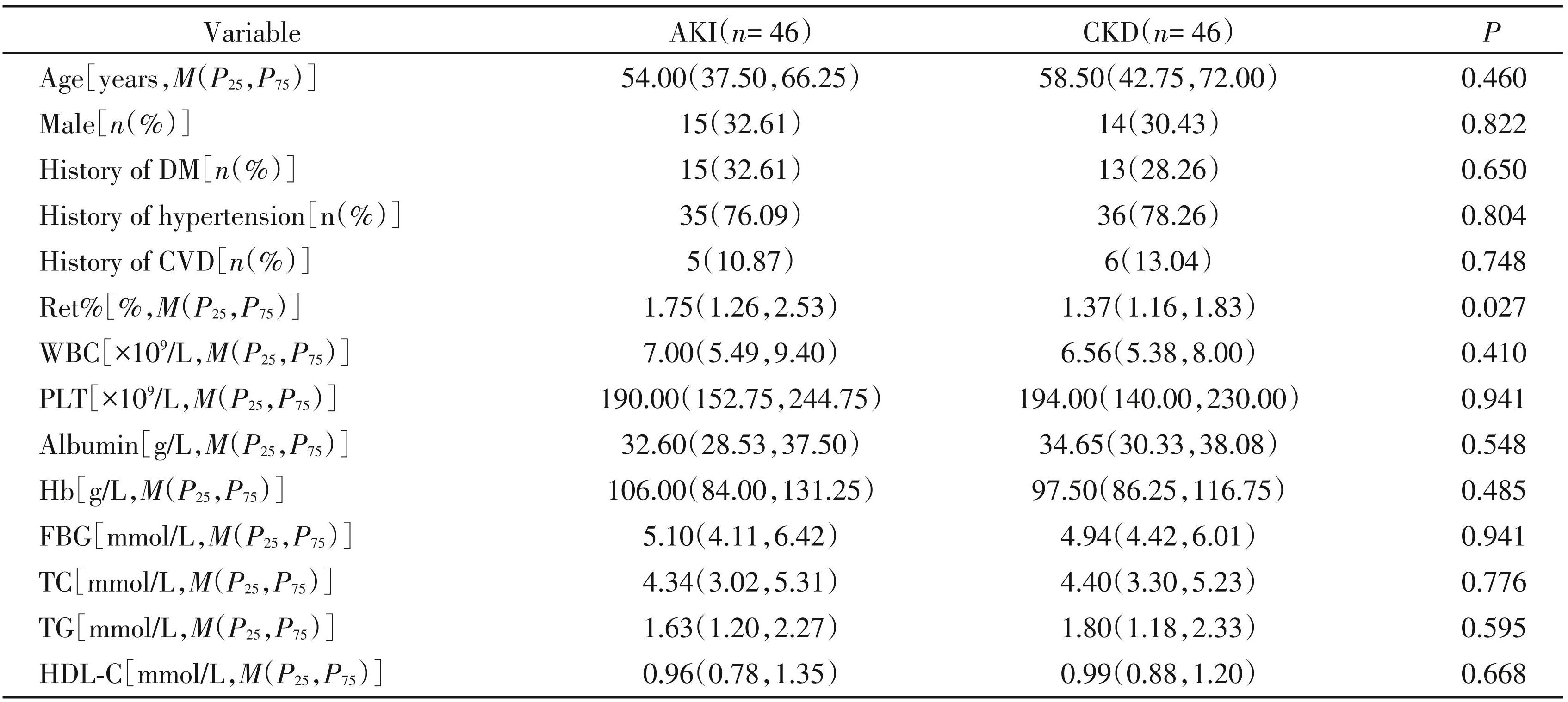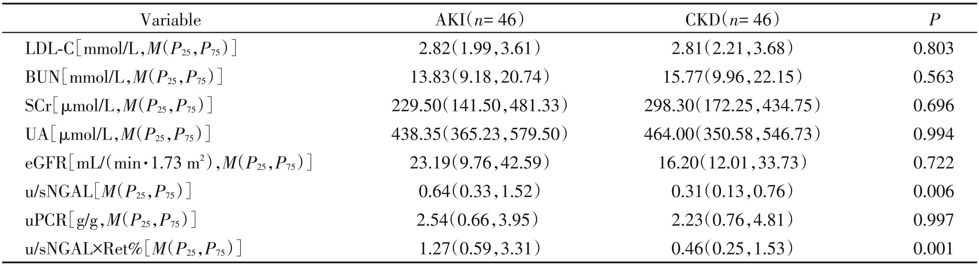 AKI:acute kidney injury;CKD:chronic kidney disease;Ret%:reticulocyte percentage;WBC:white blood cell;PLT:platelet;Hb:hemoglobin; FBG:fasting blood glucose;TC:total cholesterol;TG:triglyceride;HDL⁃C:high⁃density lipoprotein cholesterol;LDL⁃C:low⁃density lipoprotein choles⁃ terol;BUN:blood urea nitrogen;SCr:serum creatinine;UA:uric acid;eGFR:estimated glomerular filtration rate;NGAL:neutrophil gelatinase⁃associated lipocalin;u/sNGAL:the ratio of urinary NGAL to serum NGAL;uPCR:urinary protein/creatinine ratio;u/sNGAL×Ret%:the product of the ratio of urinary and serum NGAL and the percentage of reticulocytes.