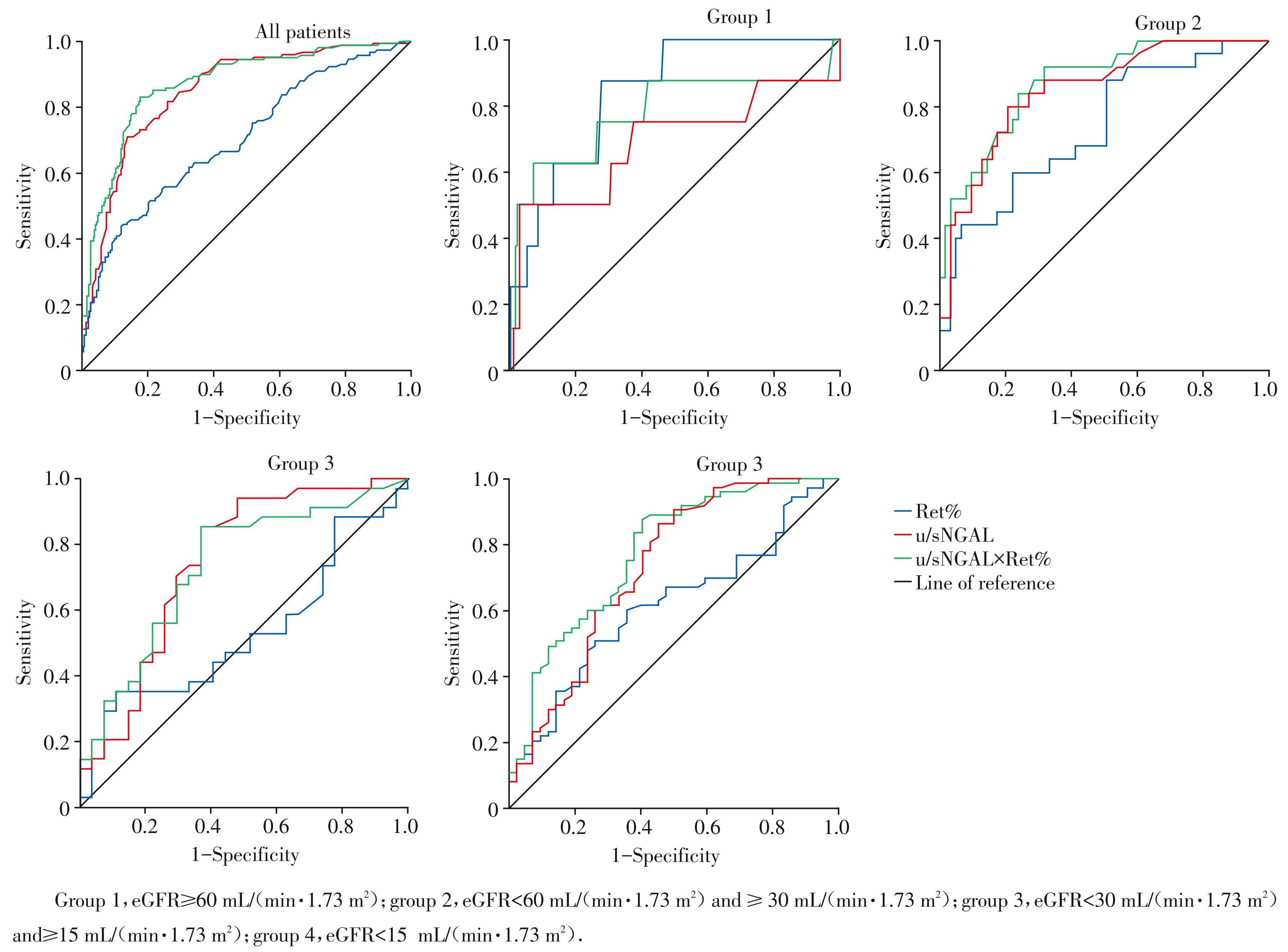 Figure1ROC curves for Ret%,u/sNGAL,u/sNGAL ×Ret%