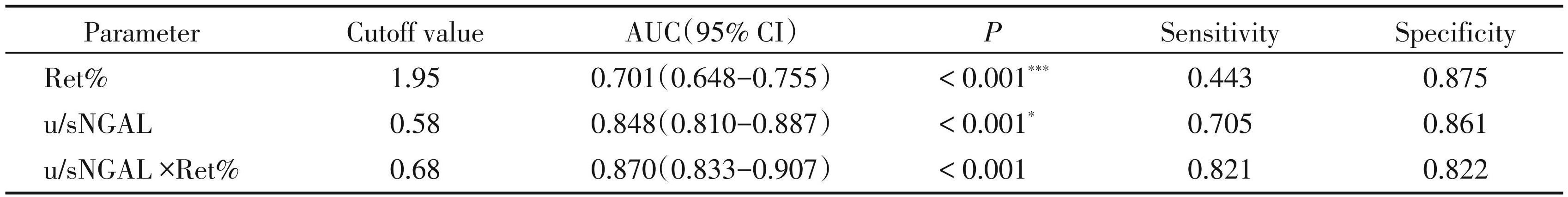 为进一步确定区分AKI和CKD的最佳生物标志物,对所有患者进行了ROC曲线分析。如图1和表3所示,Ret%的AUC为0.701(0.648~0.755),u/sNGAL 的 AUC 为 0.848(0.810~0.887),u/sNGAL × Ret% 的 AUC 为0.870(0.833~0.907)。由此可见,u/s NGAL× Ret%的 AUC 最高,且与 u/sNGAL(P=0.043)和 Ret% (P <0.001)的AUC值相比,差异均有统计学意义。