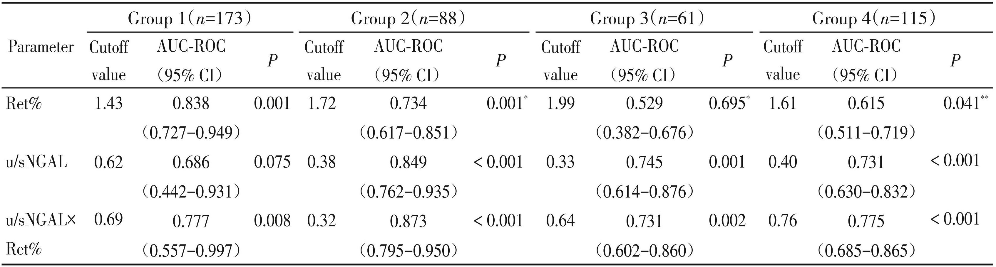按肾功能 eGFR 的值进行亚组分析(n=437)。 Ret%在组 1(P <0.001)、组 2(P <0.001)和组 4 (P=0.041)中预测AKI的发生具有价值,u/sNGAL在组 2(P <0.001)、组 3(P=0.001)和组 4(P <0.001) 中能够预测 AKI 的发生,而 u/sNGAL×Ret% NGAL 在 4 组[组 1(P=0.008)、组 2(P <0.001)、组 3(P= 0.002)和组4(P <0.001)]预测AKI的AUC均有统计学意义。u/s NGAL ×Ret% 的AUC在组2(P=0.011)、组 3(P=0.016)和组4(P=0.006)均较Ret%的AUC更高,两者差异有统计学意义。表4列出 u/sNGAL×Ret%在不同肾功能分组的截断值(组1的截断值为 0.69,组2的截断值为0.32,组3的截断值为0.64,组 4的截断值为0.76),利于临床的实际应用。如图2所示,与CKD组患者相比,AKI组患者的Ret%在组 1和组2(P <0.001)明显升高,u/sNGAL 在组2、组3 和组4(P <0.001)明显升高,而u/sNGAL×Ret%在所有的亚组中(组1、组2和组4 P 均 <0.001,组3 P <0.01)均显著增高。