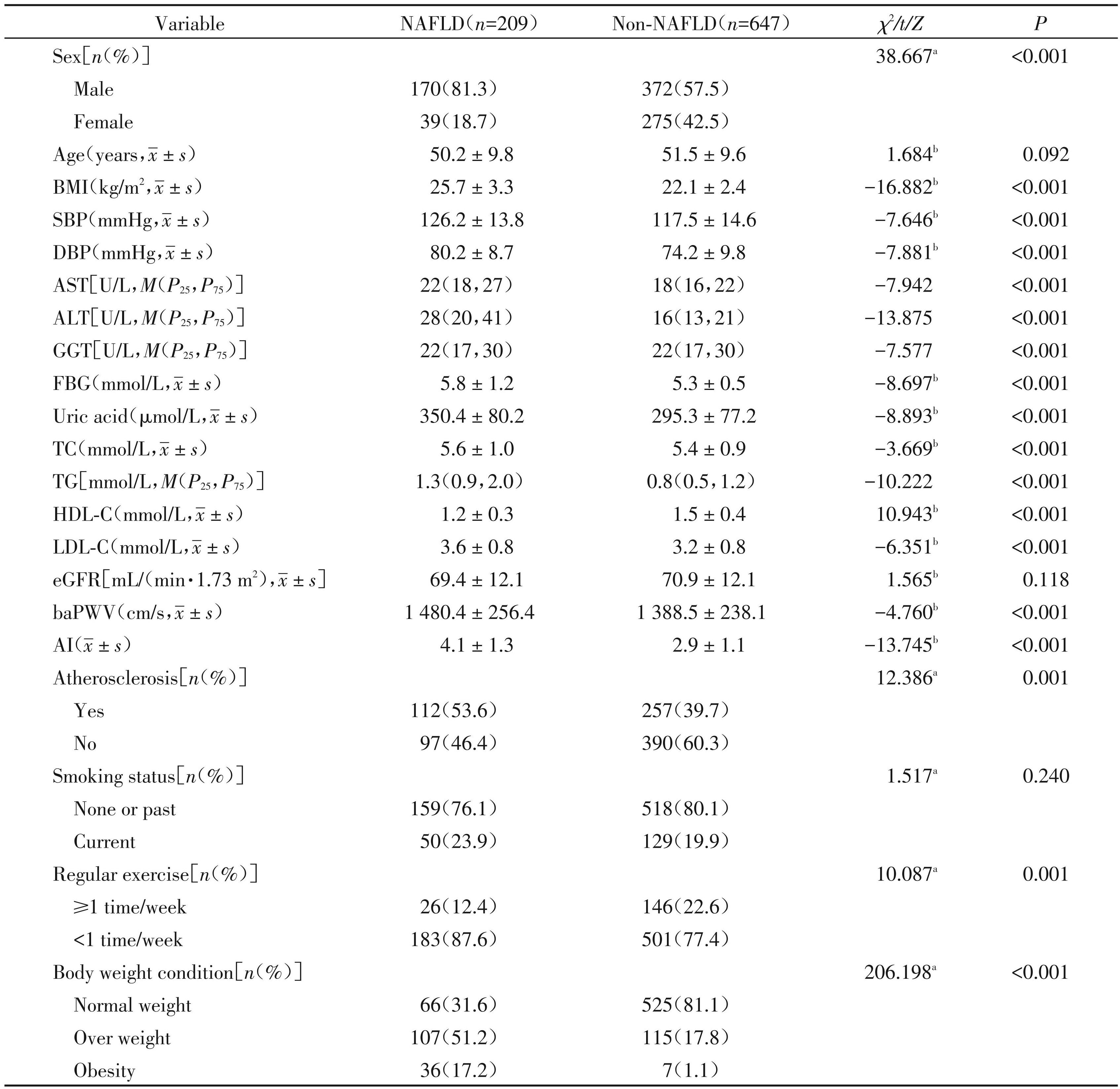 856 例参与者中 NAFLD 发生率为 24.42%, NAFLD 组和非 NAFLD 组的临床和实验室特征见表1。结果显示 NAFLD 组男性比例显著高于女性 (P <0.001)。 NAFLD 组的 BMI、SBP、DBP、AST、 ALT、GGT、FBG、血尿酸、TG、TC、LDL⁃C、baPWV 水平显著高于非NAFLD组(P <0.001),而HDL⁃C水平显著低于非NAFLD组(P <0.001),运动状态方面存在显著差异(P=0.001),eGFR 值低于非 NAFLD 组 (P <0.05),有吸烟习惯或曾经吸烟的占比高于非 NAFLD组(P <0.05),而在年龄、eGFR、吸烟情况、饮酒情况方面两组间差异无统计学意义(P >0.05,表1)。