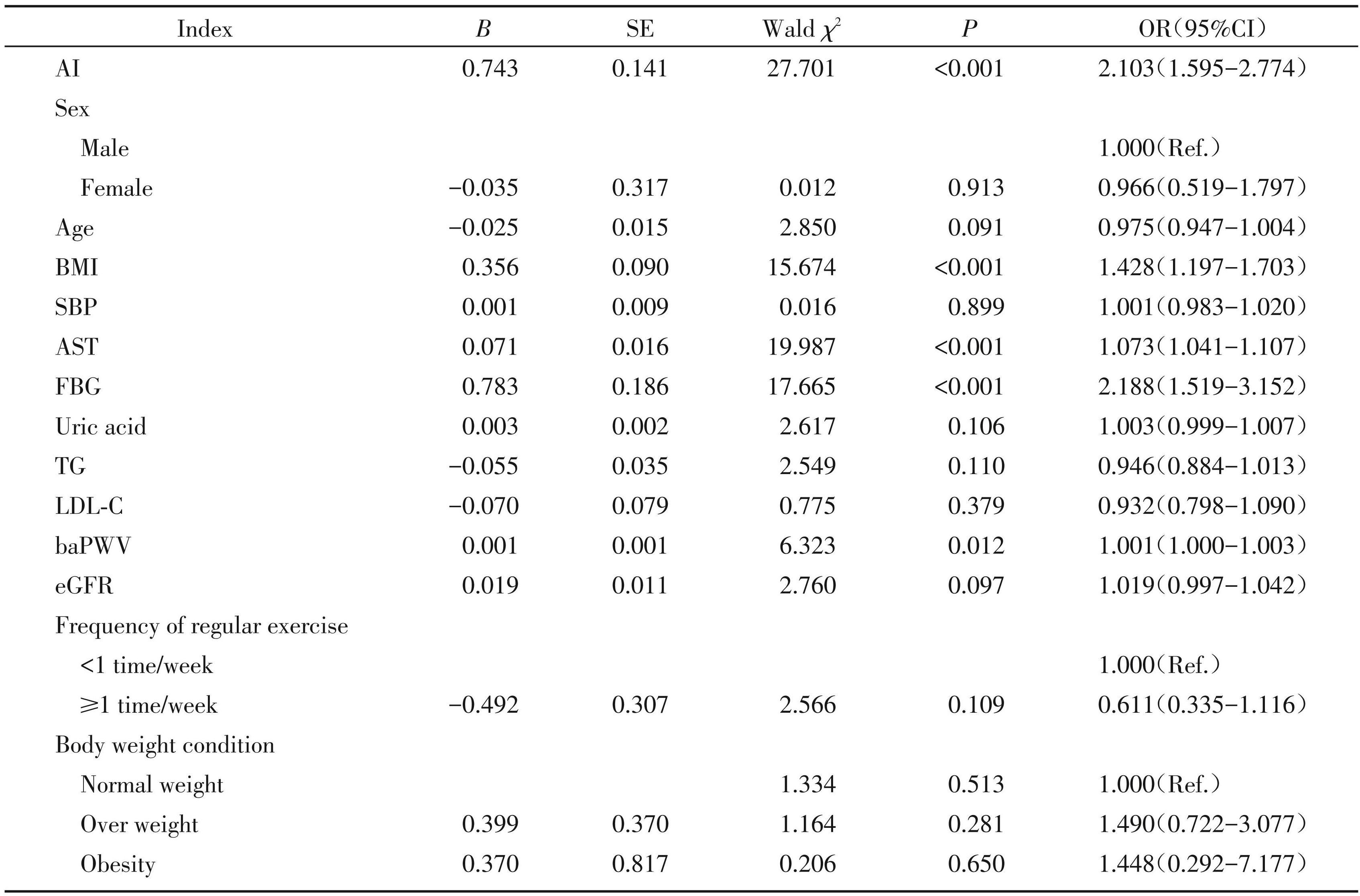 排除VIF>5的变量后,以是否为NAFLD为因变量(赋值:否=0,是=1),以性别(赋值:男性=1,女性= 2)以及单因素分析中P <0.1的因素(赋值:无规律运动=0、每周至少 1 次运动=1;体重正常=0、超重= 1、肥胖=2)作为自变量进行二元多因素Logistic回归分析,结果显示 AI、BMI、AST、FBG、baPWV 是 NAFLD 的影响因素,均与 NAFLD 呈正相关。该模型R2 =0.366,Nagelkerke R2 =0.546(表2)。