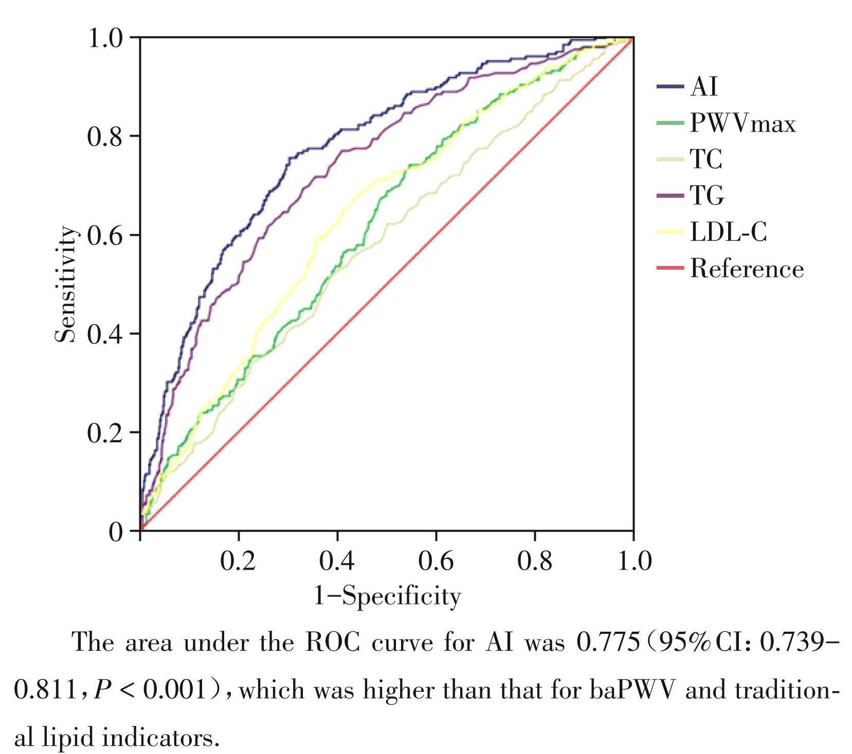 AI 的 AUC 为 0.775(95% CI=0.739~0.811,P <0.001),高于同为血管硬化指标的 baPWV(AUC= 0.616,95%CI=0.574~0.659,P <0.001;DeLong检验,P <0.001),也高于传统血脂指标 TC(AUC=0.576, 95% CI=0.532~0.621,P=0.001;DeLong 检验,P <0.001)、TG(AUC=0.735,95% CI=0.696~0.774,P <0.001;DeLong 检验,P=0.013)、LDL⁃C(AUC=0.639, 95% CI=0.597~0.681,P <0.001;DeLong 检验,P <0.001),提示AI具有更优异的预测能力(图2)。