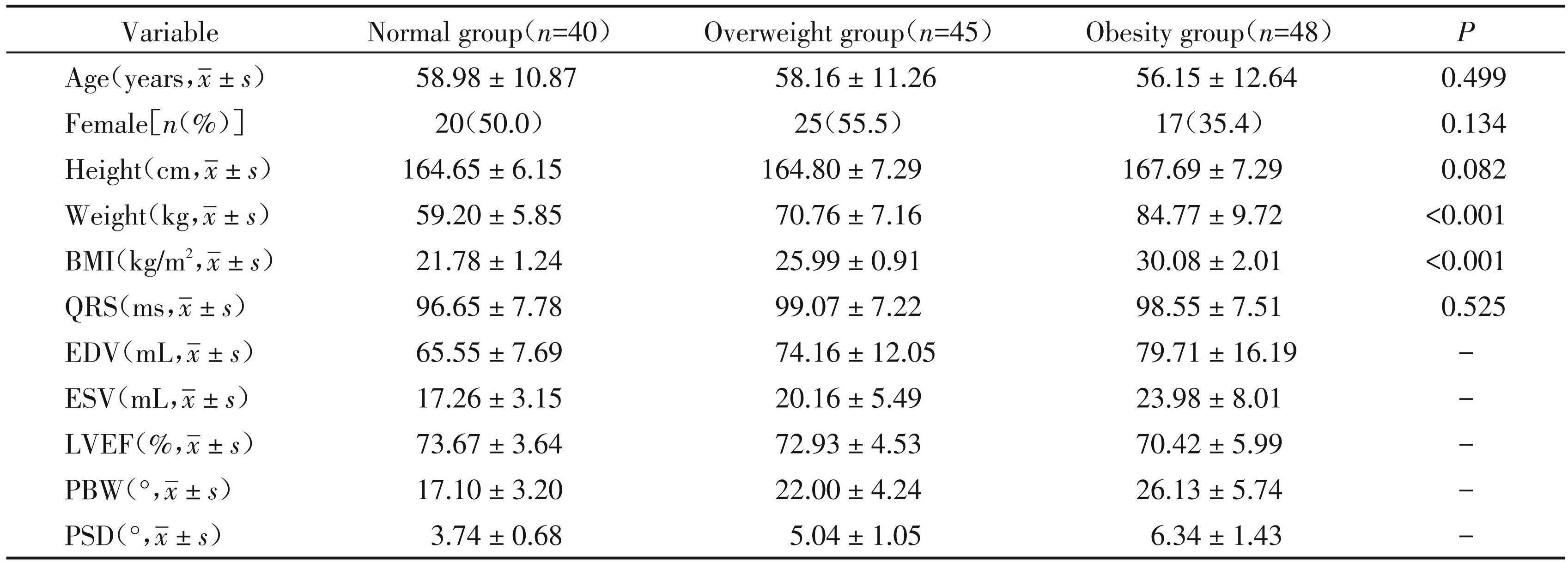 如表1所示,本研究共纳入133例患者,正常组 40例(女20例),年龄(58.98±10.87)岁,BMI(21.78± 1.24)kg/m2;超重组 45 例(女 25 例),年龄(58.16± 11.26)岁,BMI(25.99±0.91)kg/m2;肥胖组 48 例 (女 17 例),年龄(56.15±12.64)岁,BMI(30.08± 2.01)kg/m2。统计分析显示,所有数据符合正态分布,3组间的性别、年龄、身高、QRS间期差异均无统计学意义(P均>0.05),体重和BMI的差异则有统计学意义(P均<0.001)。