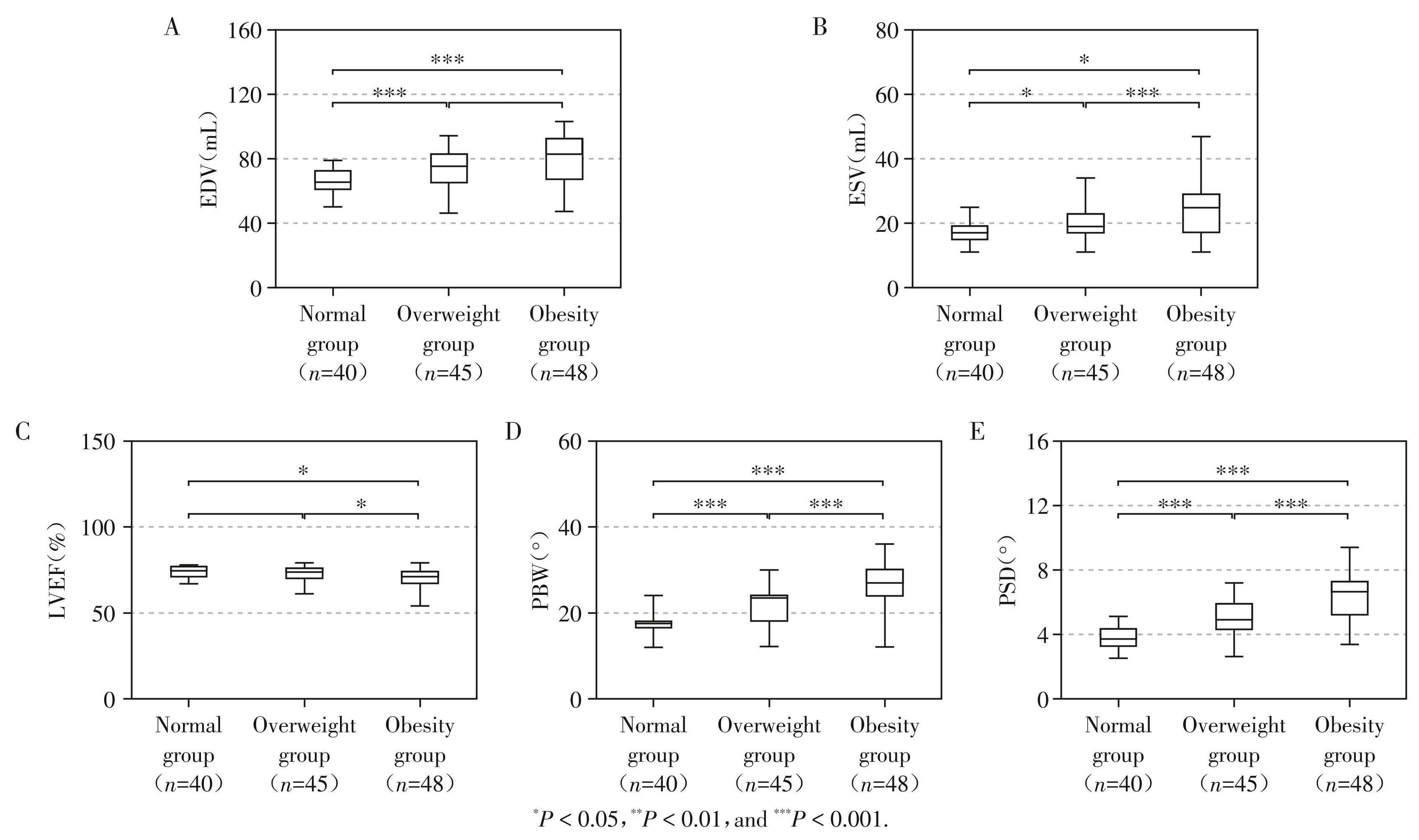 Figure1Box⁃plots of comparison of EDV(A),ESV(B),LVEF(C),PBW(D),and PSD(E)among the three groups of patients