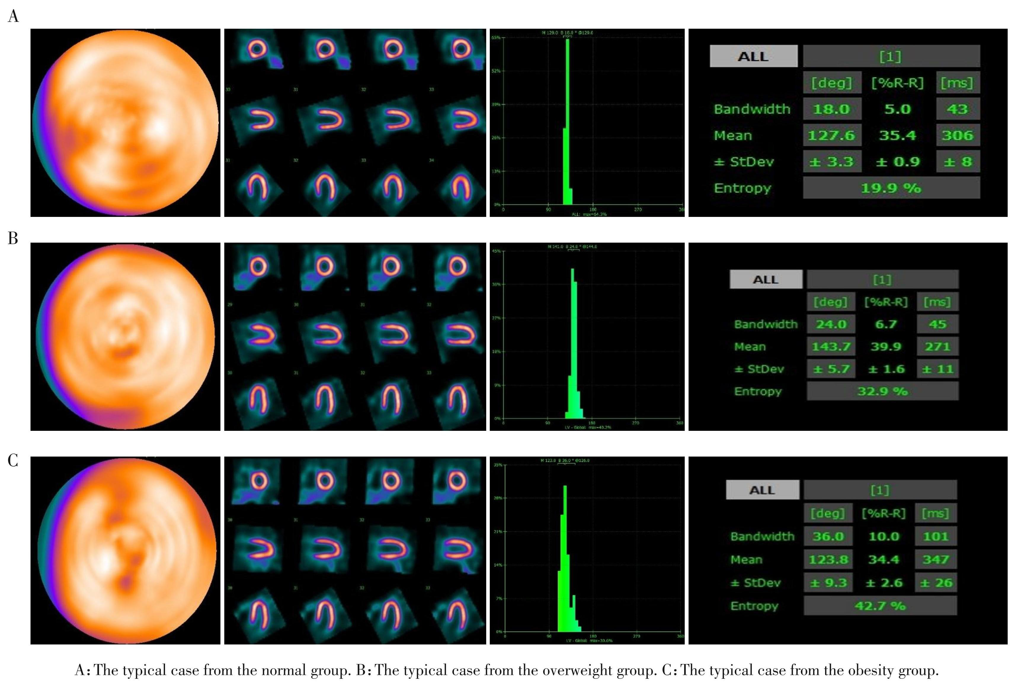 本研究从3组人群中各选取1例典型病例进行分析:正常组56岁女性(BMI 22.5 kg/m2)表现为MPI 灌注和极坐标靶心图未见异常,相位直方图显示狭窄而尖锐的柱状图,LVMD 参数(PBW 18°、PSD 3.3°)提示收缩同步性良好;超重组 43 岁女性(BMI 25.7 kg/m2)灌注显像未见异常,但表现为相位直方图变宽,LVMD 参数(PBW 24°、PSD 5.7°)较正常组升高;肥胖组 55 岁女性(BMI 30 kg/m2)虽灌注显像未见异常,但相位直方图显著增宽且紊乱,LVMD参数(PBW 36°、PSD 9.3°)相比前两组呈现更明显的异常升高趋势(图2)。