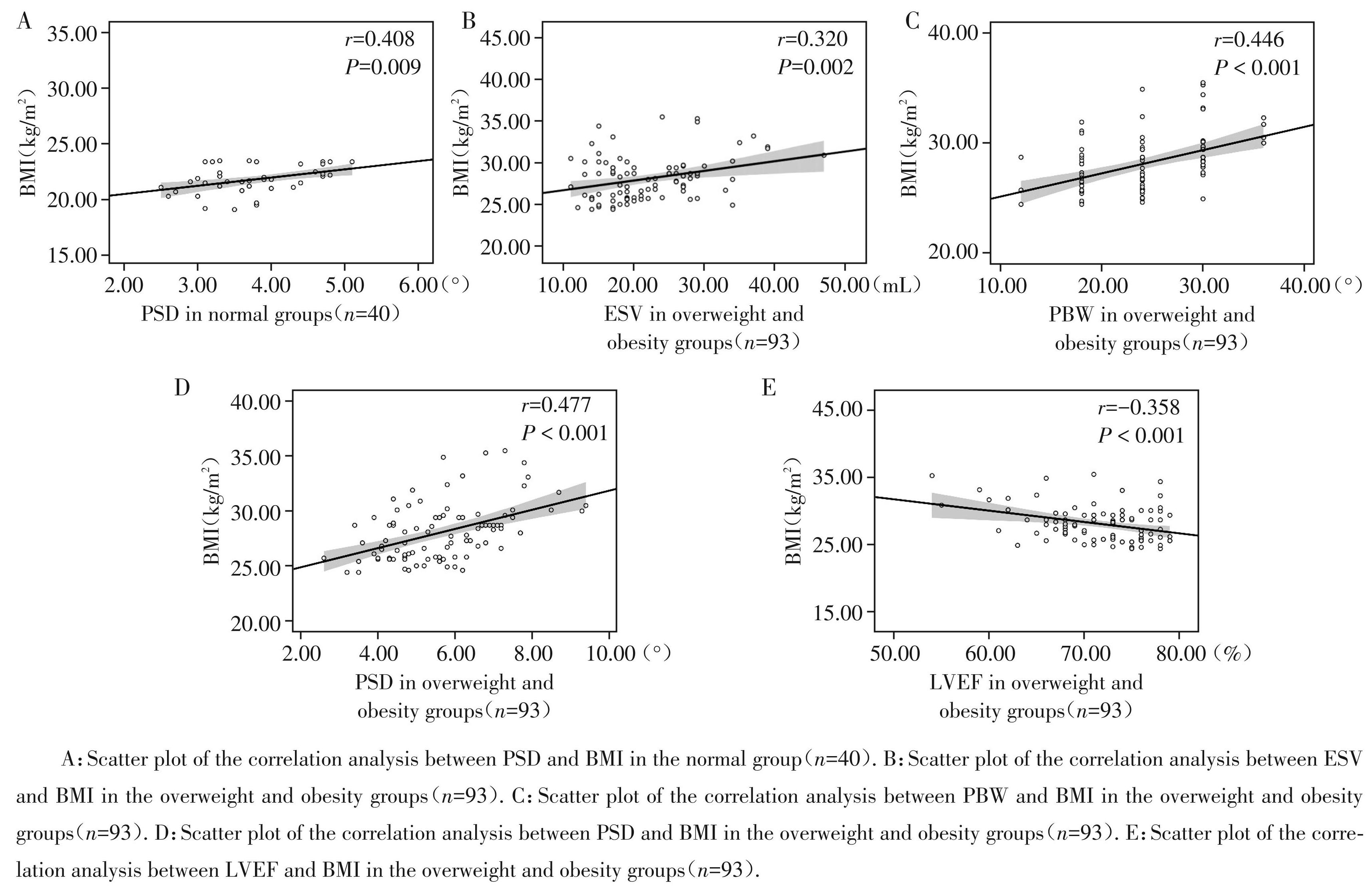 Pearson 相关分析结果显示,正常组患者仅有 PSD与BMI显著正相关(r=0.408,P=0.009)。与之对应的,超重和肥胖患者的PBW(r=0.446,P<0.001)、 PSD(r=0.477,P<0.001)、ESV(r=0.320,P=0.002)与 BMI呈显著正相关,LVEF(r=-0.358,P<0.001)则与 BMI呈显著负相关(图3)。