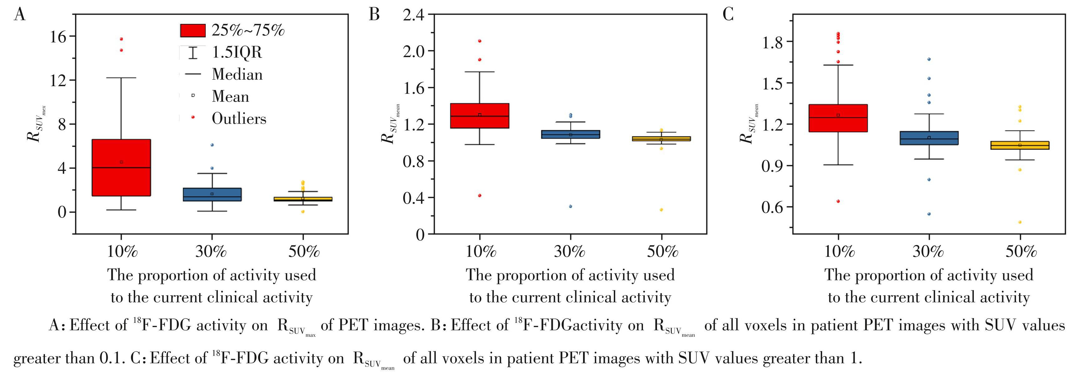 进一步,本研究采用箱线图对所有患者PET影像中SUV值受18F⁃FDG活度的影响规律进行统计分析。箱线图是一种基于数据四分位数的统计图形工具,可直观展示数据的集中趋势、离散程度及异常值情况[21]。箱体的上下边缘分别对应所有数据的 25%分位数与 75%分位数,箱体所覆盖的范围代表数据中间 50%的分布范围即四分位间距 (interquartile range,IQR);箱体中间的横线表示中位数;图中上下“须”分别延伸至不超过1.5×IQR范围内的最小值与最大值,用以表示大多数非异常数据的取值范围,而超过该范围的数值被视为异常值,并在图中以单独的点标出。