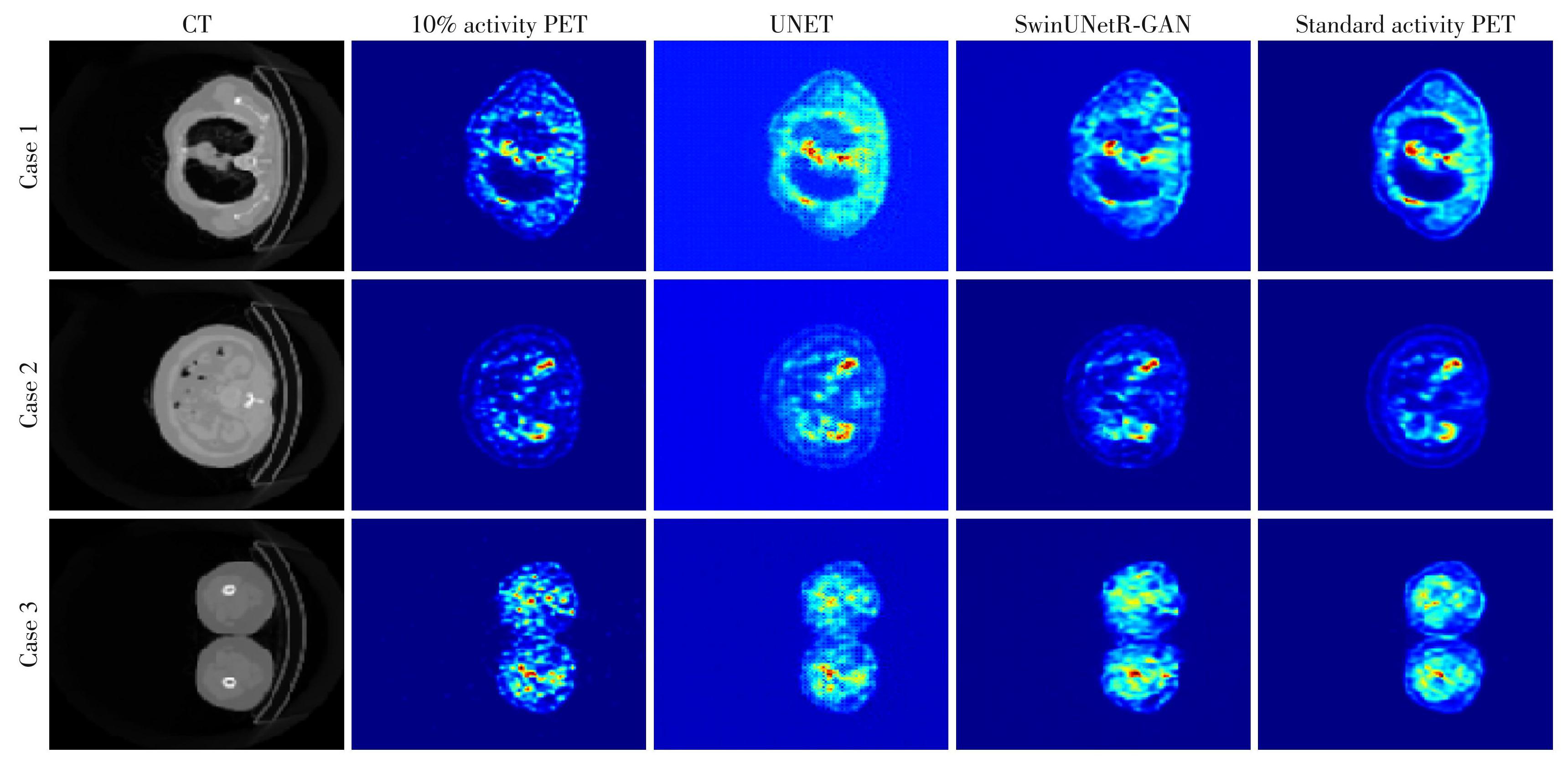 Figure3Results of CT,10% activity PET images,UNET,SwinUNetR⁃GAN,and standard activity PET images for different cases