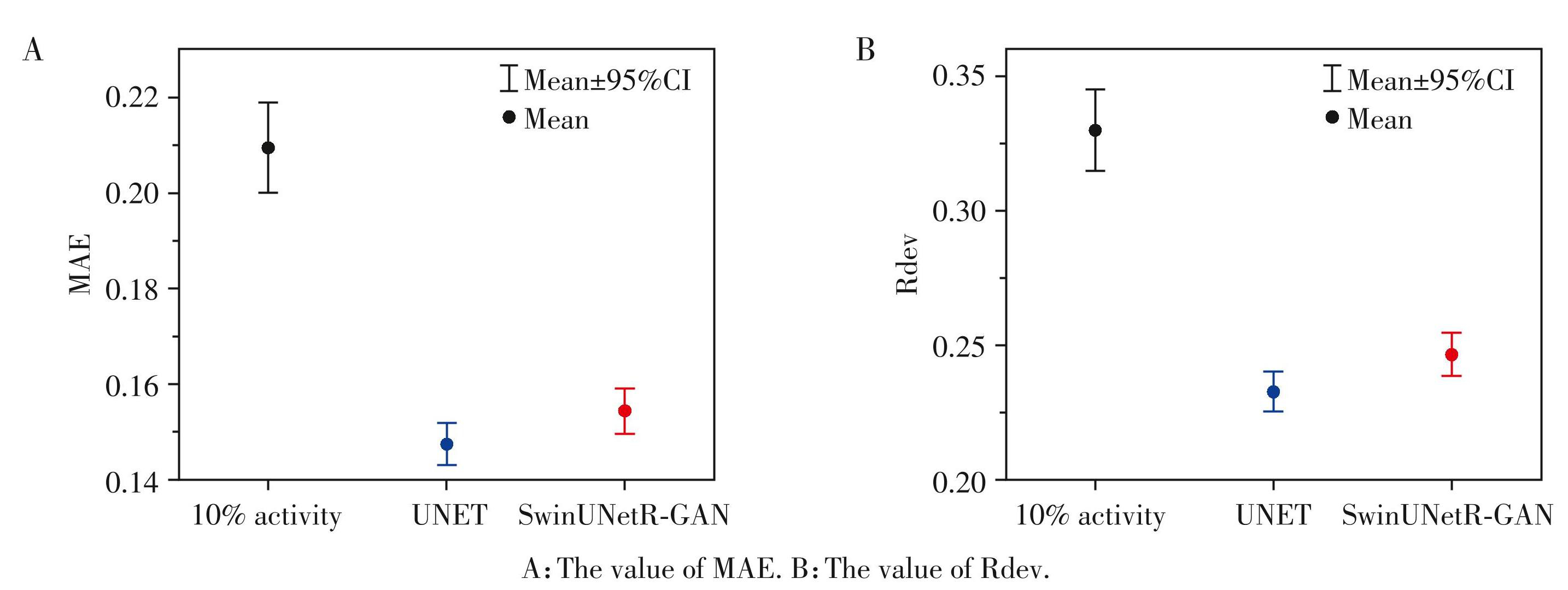 为确保患者疾病的精准诊断,并降低患者所受辐射剂量,本研究将 Swin Transformer 编码器与 UNET 解码器融合,搭建了一款专用于低18F⁃FDG活度PET 影像质量恢复的深度学习网络,即SwinUNetR⁃GAN。采用临床给药活度 10%的 18F⁃FDG 给药方法时,使用 SwinUNetR⁃GAN 网络对该活度下的 PET 影像进行特征分析与优化,可输出高质量的PET影像。可视化分析可知,采用 SwinUNetR⁃GAN 网络得到的 PET 影像中,患者的热区分布与标准 18F⁃FDG 活度 PET影像相似,热区集中,且噪声水平明显低于UNET 网络结果。此外,在定量分析方面,本研究选择每例患者每层 PET 影像中 SUV 大于该层 SUV 最大值 50%的像素区域进行 SUV 值比较,结果表明,本研究搭建的 SwinUNetR⁃GAN 网络可降低低 18F⁃FDG 活度PET影像的噪声,MAE可由优化前的0.21降低至0.15,Rdev可由优化前的0.33降低至约0.25,虽然该数据结果要稍大于UNET结果,但结合视觉分析法可知,本研究搭建的SwinUNetR⁃GAN网络是全局噪声抑制,可确保处理后的PET影像具备临床应用潜力。